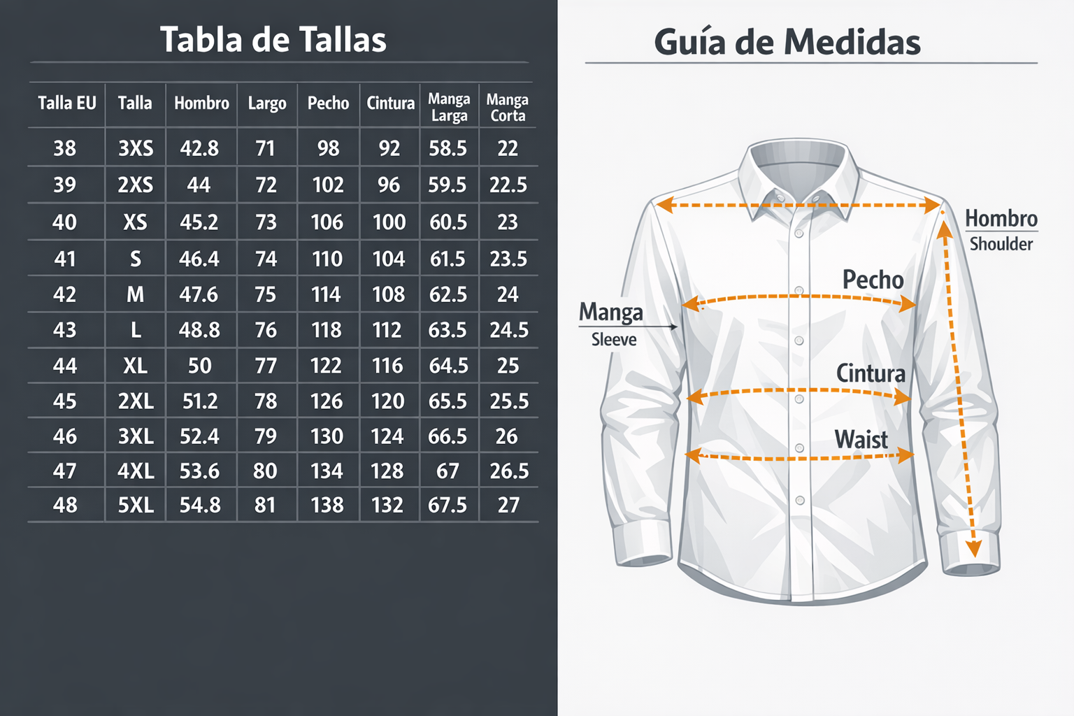 | Talla EU | Talla | Hombro | Largo | Pecho | Cintura | Manga Larga | Manga Corta |